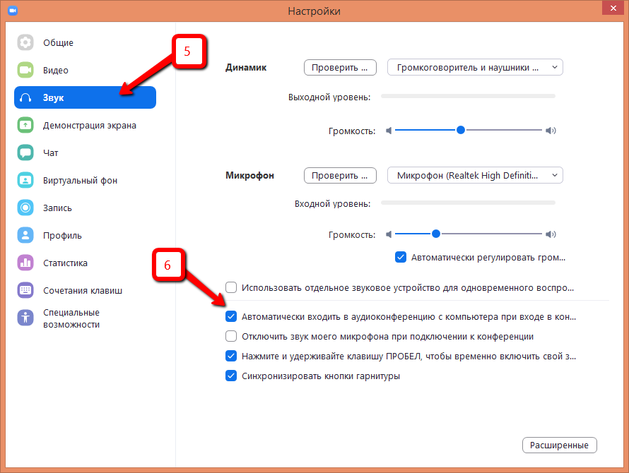 В окне настроек звука необходимо перейти в пункт «Звук» (5), где проверить наличие «галочки» в пункте «Автоматически входить в аудиоконференцию с компьютера при входе в конференцию» (6).