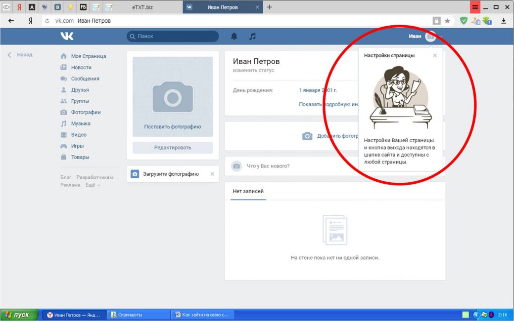 В первый раз нужно войти на сайт кнопкой «Войти». Потом вход в Контакт будет таким, как на картинке ниже, если нажать на свое имя, откроется именно твоя страница, где вся информация о тебе, где можно писать статусы, загружать фото и тому подобное. Нажимая на слово «Сообщения», ты откроешь свои переписки. При нажатии в любом другом месте (например, на синем заголовке), сайт откроется как обычно, на ленте новостей: