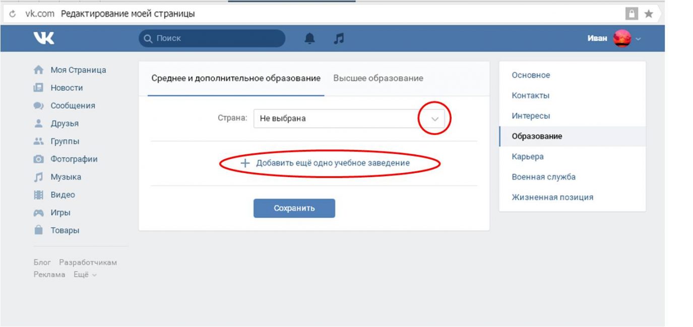 На данной странице следует заполнить пункты об образовании: высшем, среднем и начальном. Существует возможность, как внести все детали, так и остановиться на названии учебного заведения.