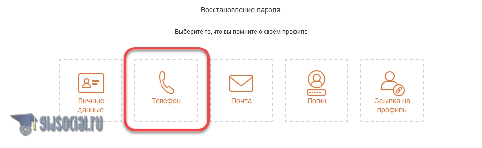 - Далее выберите способ восстановления пароля. Это могут быть: личные данные, телефон, почта, логин или ссылка на профиль. Мы будем использовать именно телефон.
