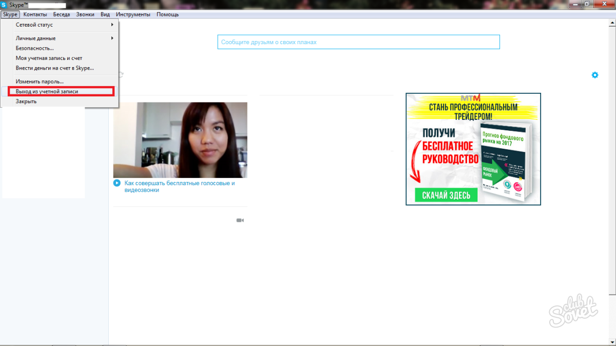 Первый вариант самый простой. Достаточно зайти на главную Skype, кликнуть на « », выбирая пункт «Выход из учетной записи»