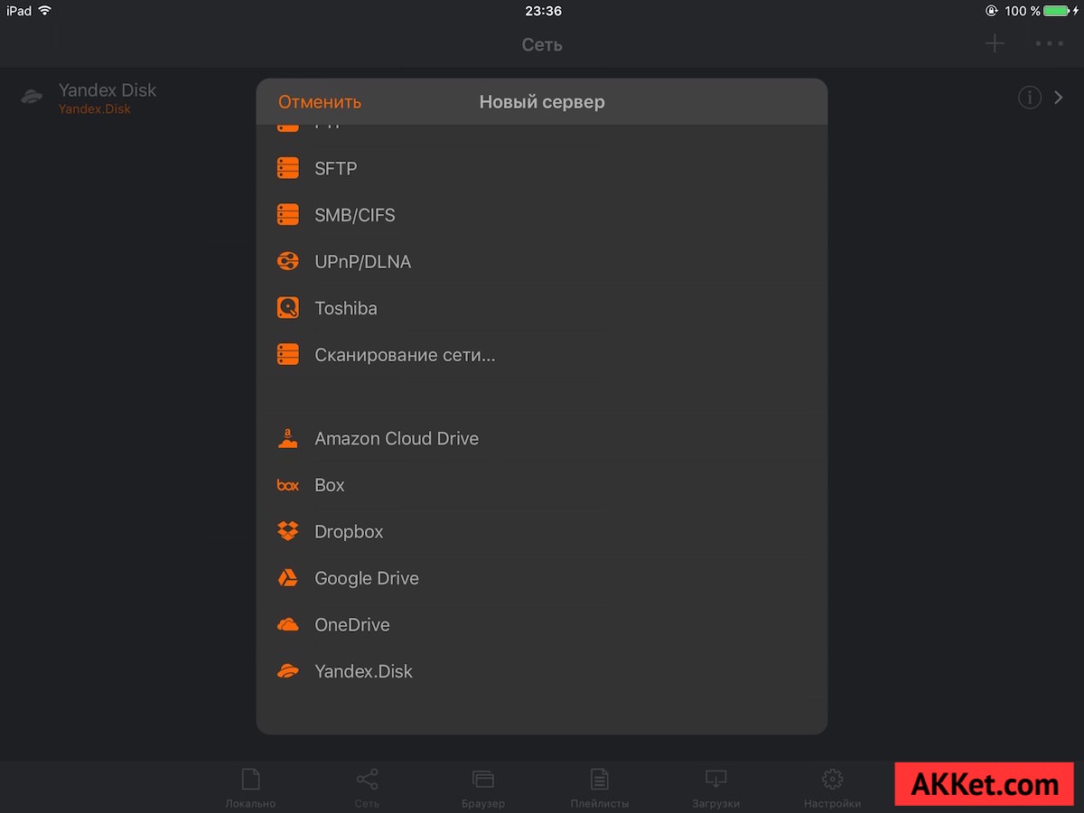 Список поддерживаемых облачных хранилищ: Amazon Cloud Drive, Box, Dropbox, Google Drive, OneDrive и Yandex Disk. Также смотреть фильмы в режиме онлайн можно со следующих типов серверов: WebDav, FTP, STFP, SMB/CIFS, UPnP/DLNA и Toshiba.