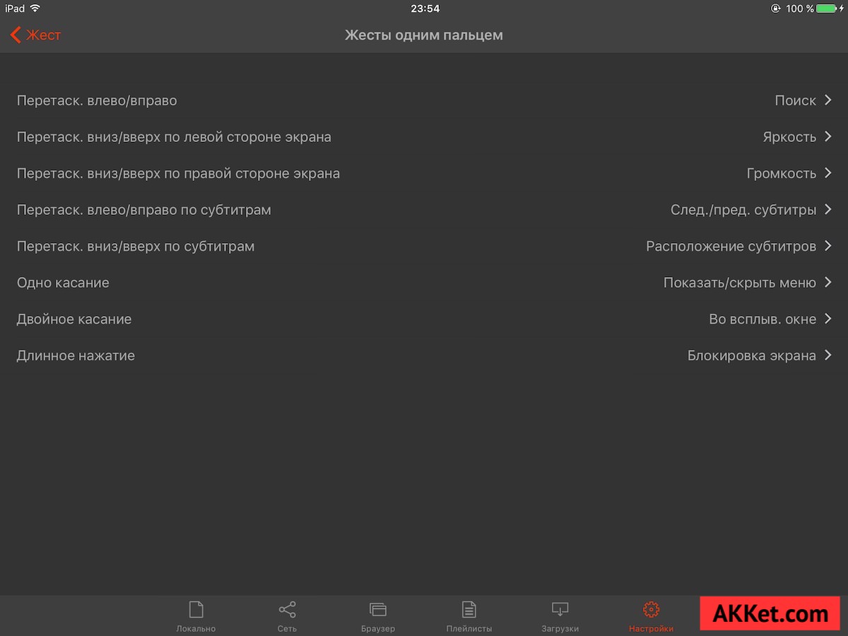 Список настроек nPlayer настолько велик, что перечислить все настраиваемые параметры просто невозможно. В программе-видеоплеере для iOS можно поменять практически все, начиная от внешнего оформления (цветов) и заканчивая выбором событий для обработки жестов.