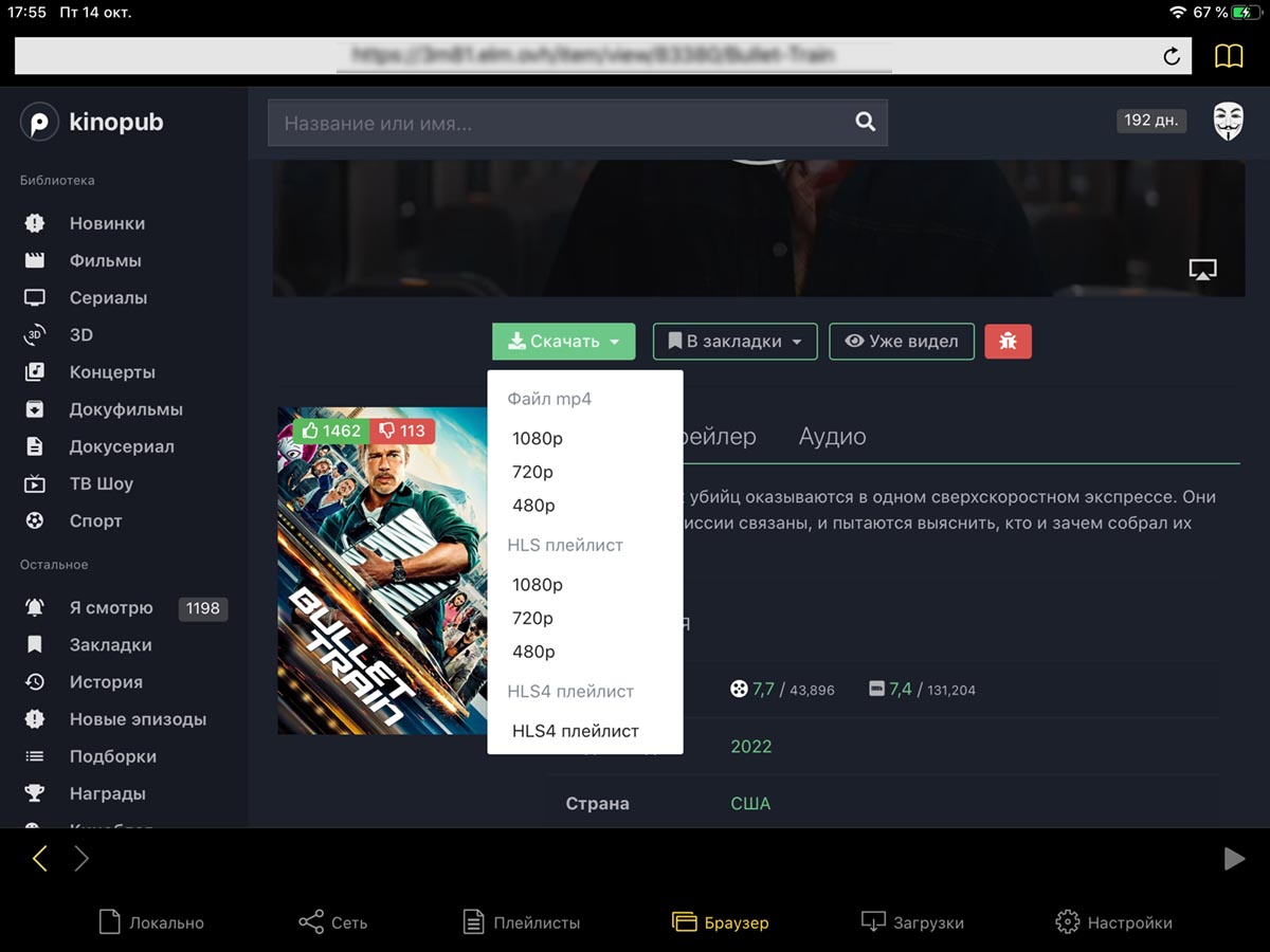 Мой любимый стриминговый сервис Kinopub позволяет загружать фильмы и сериалы для дальнейшего просмотра без подключения к сети, лишь бы места на устройстве хватало.