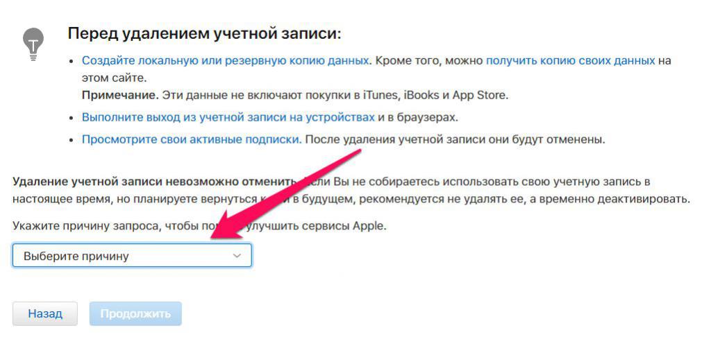 Важно! Перед удалением нужно выйти из Apple ID на всех устройствах и создать резервную копию данных.