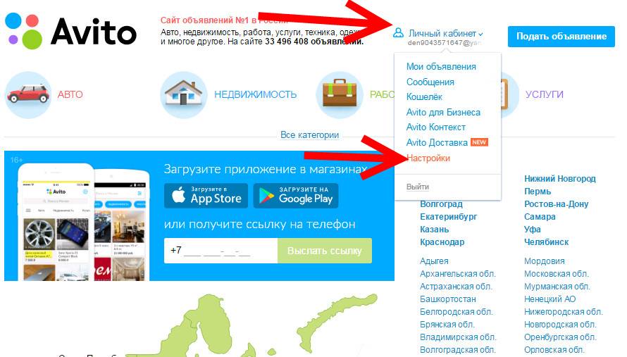 Иногда нам требуется изменить контактную информацию в объявлении. Бывает это по разным причинам. Например, хочется, чтобы о нашем товаре узнали и в другом городе, тем более что там могут оказаться покупатели с деньгами. Для того чтобы на Авито изменить город в объявлении, нужно перейти в Личный кабинет (нажав на своё имя в правом верхнем углу окна, если вы авторизованы) и нажать «Настройки», как это показано на рисунке 12.