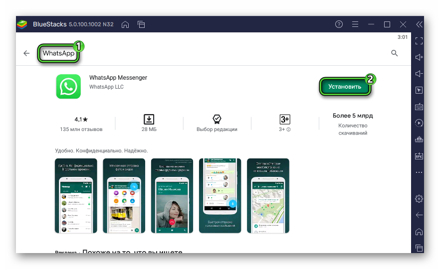 Появится стандартный интерфейс магазина. Активируйте область поиска вверху и введите там WhatsApp, а затем нажмите Enter на клавиатуре для поиска. На странице результатов нажмите кнопку «Установить» рядом с названием мессенджера.