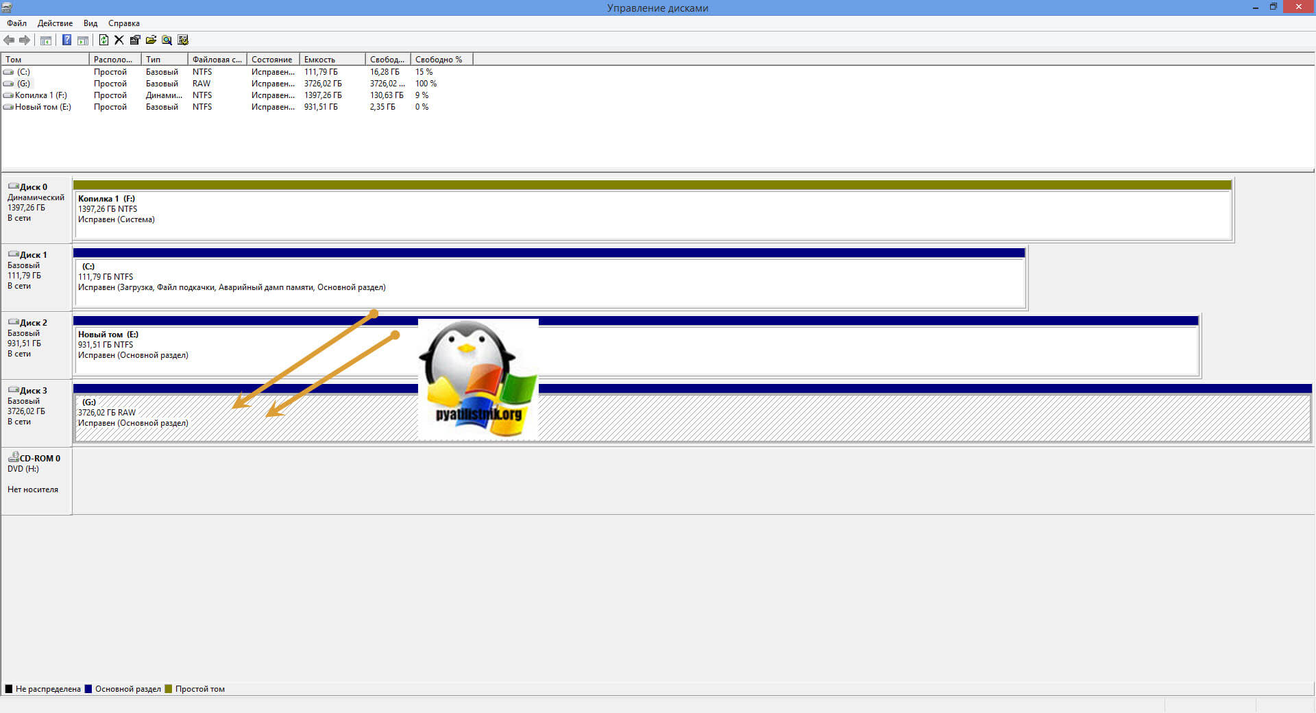 Я открыл оснастку «Управление дисками (diskmgmt.msc)». Сама оснастка так же минут 5 открывалась и тупила. В итоге я получил список своих жестких дисков, и какого же было мое удивление, что я увидел у моего 4-х терабайтного диска, файловую систему RAW, буква у него была назначена.