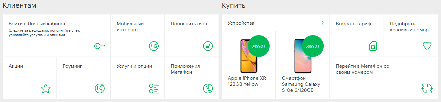 - Купить. Раздел содержит актуальные предложения из интернет магазина (со скидками), ссылки на выбор тарифа, подбор красивого номера и функцию перехода в Мегафон со своим номером (от другого оператора мобильной связи).
