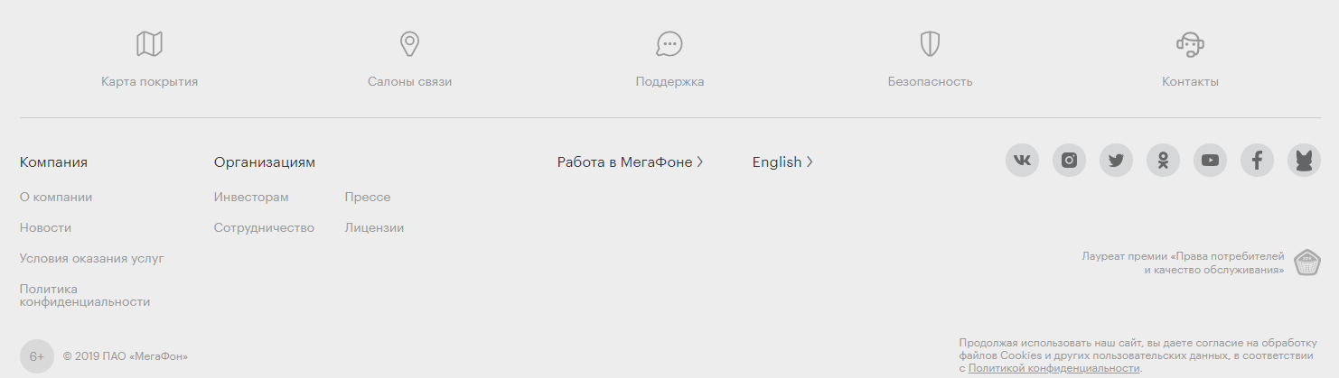 Блок нижней навигации содержит информацию о компании, а также дополнительные разделы для прессы или инвесторов. Здесь можно посмотреть свободные вакансии и выбрать английскую версию сайта megafon.ru. В правом блоке отображаются ссылки на социальные сети Вконтакте, Инстаграм, Твиттер, Одноклассники, Ютуб, Фейсбук.