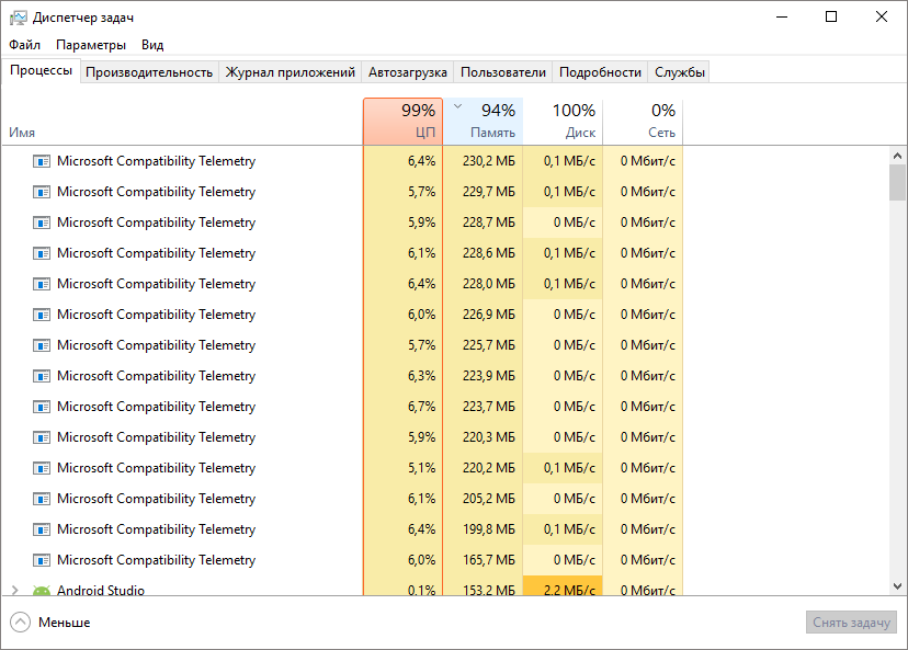 Если один из них имеет название Microsoft compatibility telemetry, посмотрите, как много памяти он занимает – обычно нагрузка очень велика.
