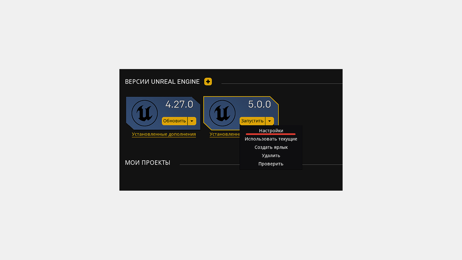 Кроме версий движка в «Библиотеке» есть раздел «Мои проекты» (My Projects). Здесь собраны все ваши проекты на Unreal Engine всех версий. В этом окне с ними можно проводить базовые манипуляции. Щёлкнув правой кнопкой мыши по иконке проекта, его можно открыть, просмотреть содержимое в проводнике Windows, сделать копию, создать ярлык на рабочем столе для быстрого запуска или удалить.