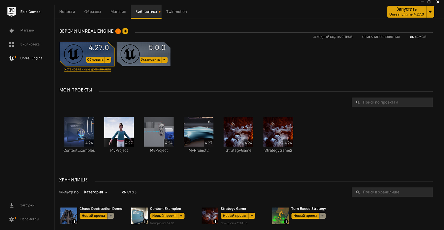Скачать движок можно из лаунчера Epic Games. Достаточно зайти в раздел Unreal Engine и перейти во вкладку «Библиотека» (Library). Клиент уже доступен к установке во вкладке «Версии Unreal Engine» (Engine Versions). По умолчанию он будет установлен в папку /Epic Games на жёстком диске.