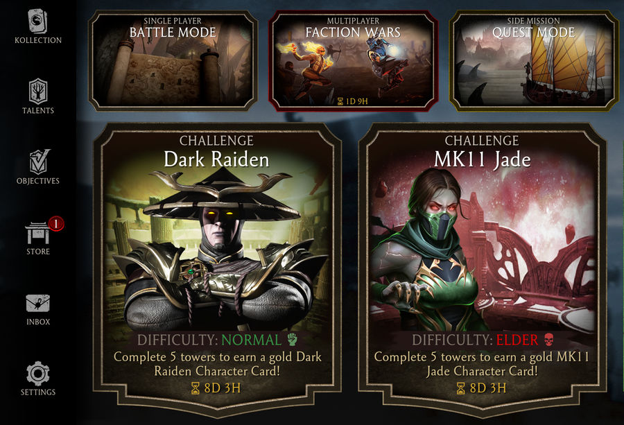 X-Ray атаки и Фаталити также включены в игру, но с ограничениями. Фаталити доступны только для некоторых персонажей в некоторых башнях, а X-Ray могут производить только «золотые персонажи». Чтобы прокачивать свои карты персонажей и получать деньги и души можно проходить башни или участвовать в онлайн-битвах против карт других игроков в битве фракций. Все карты соперника управляются искусственным интеллектом. Есть четыре типа карт персонажей: бронзовые, серебряные, золотые и алмазные, с различными вариациями и костюмами.
