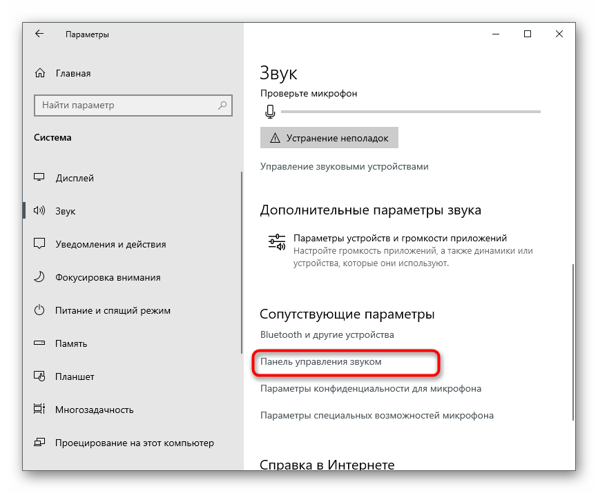 - Последовательно откройте «Параметры» > «Система» > «Звук» и перейдите в «Панель управления звуком».