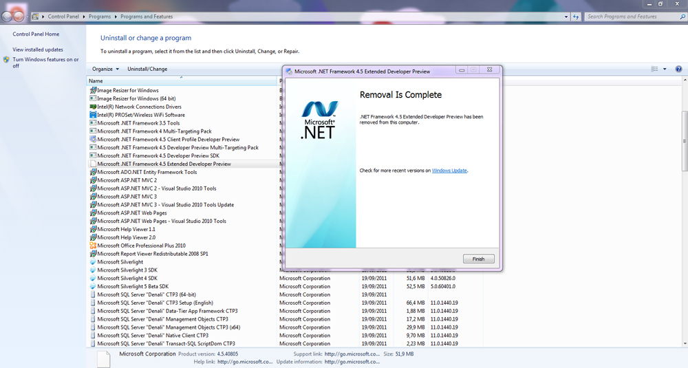 Чтобы установить NET.Framework на Windows 7, первоначально следует удалить предыдущие следы установки всех версий. Неопытным пользователям достаточно сложно проделать такие манипуляции, поскольку компания Microsoft достаточно плотно «переплела» системные папки с папками платформы. По этой причине предыдущая версия может очень сложно удаляться, или, вообще, нет возможности от неё «избавиться».