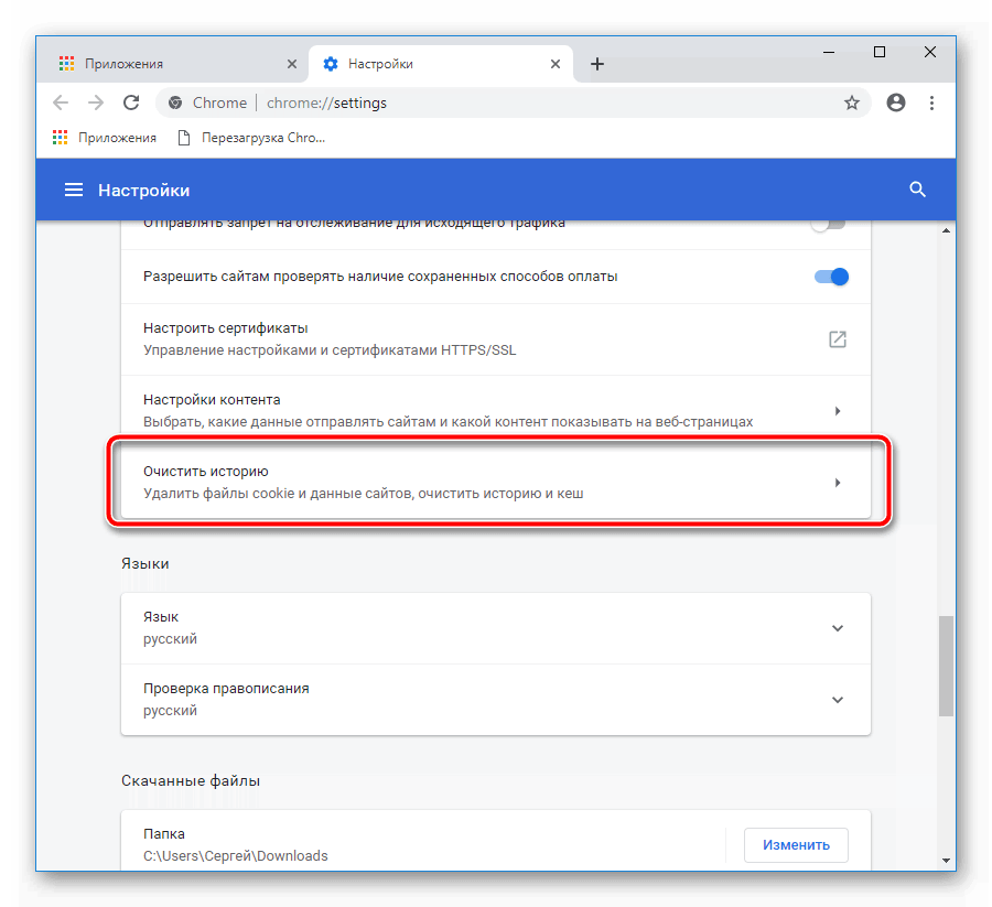 После необходимо выйти из своего аккаунта Гугл, (если вы были авторизованы) и очистить кеш браузера, удалить все данные, историю просмотров, файлы cookie. Для этого откройте «Настройки» и в разделе «Конфиденциальность и безопасность» выберите раздел «Очистить историю».