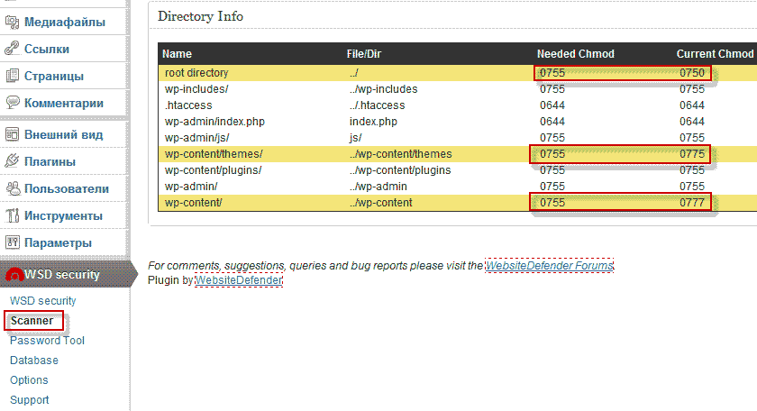 В пункте «Scanner» Вы увидите права доступа к файлам и директориям блога.