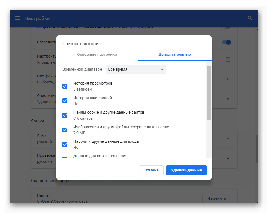 Здесь, открывшемся окне отметьте галочками все «Основные» и «Дополнительные» настройки, которые необходимо удалить. Выберите период «За всё время».