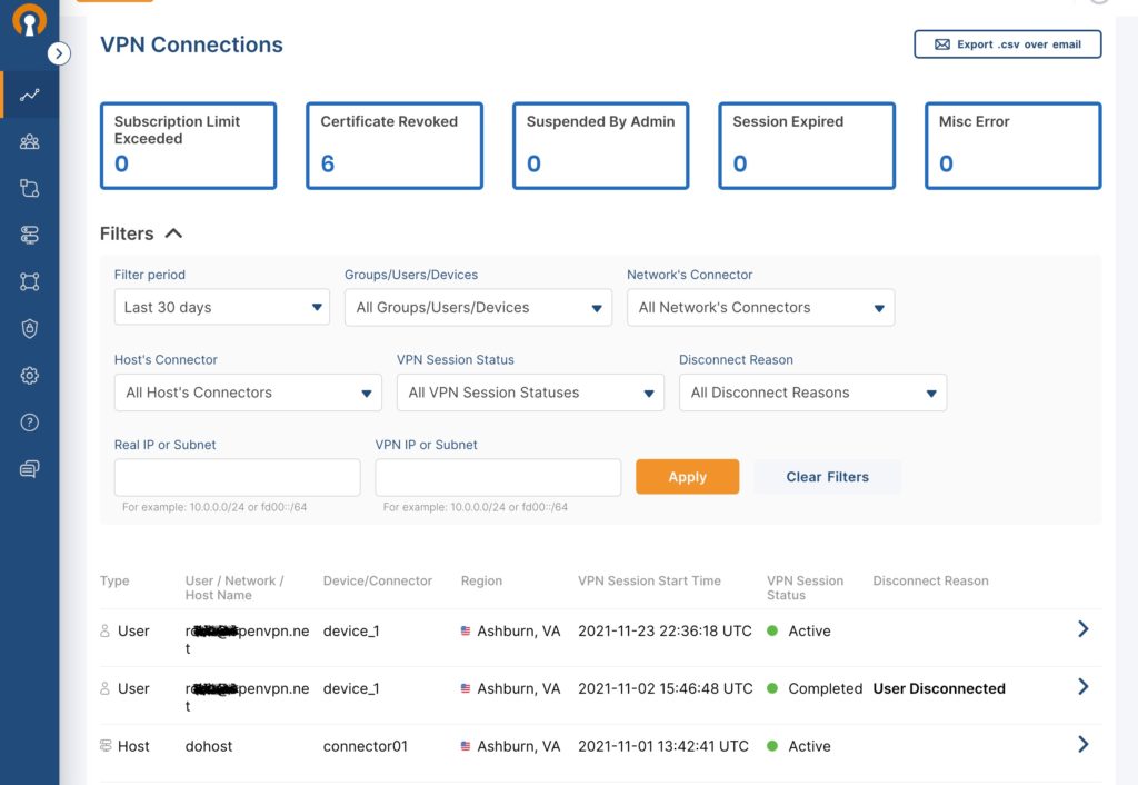 To see the VPN connections for a specific Connector, Group/User/Device, Status, Disconnect Reason, or the public or VPN IP address, carry out the following steps: