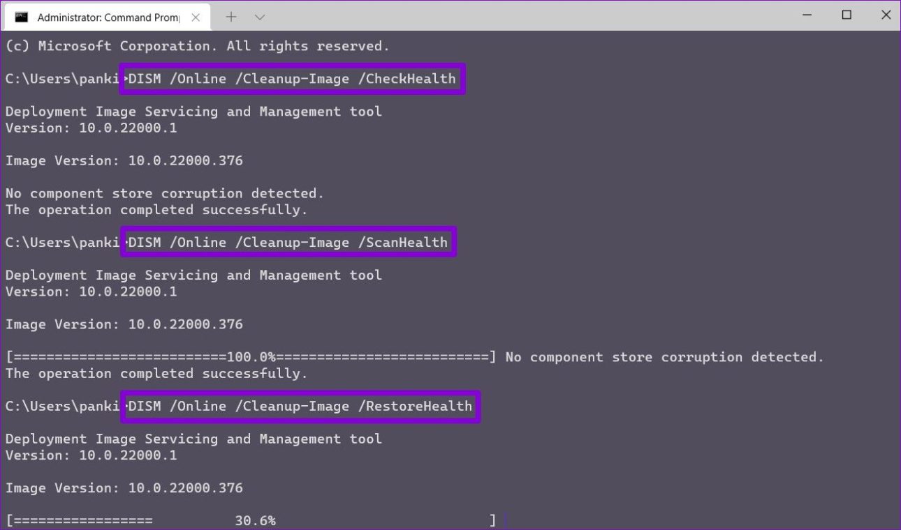 - Dism/Online/Cleanup-Image/CheckHealth;