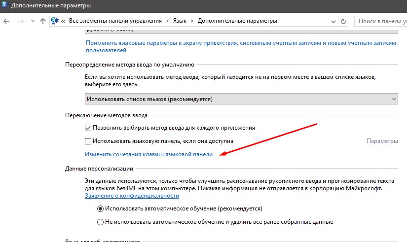 Как только дополнительные параметры открылись листайте окно немного вниз и нажимайте на ссылку “Изменить сочетания клавиш языковой панели”.