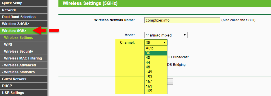 Раз уж говорим про каналы 5 ГГц, то ради полноты картины расскажу вам и про другие каналы. Так, в настройках роутеров, выпущенных для использования в США, кроме каналов 36, 40, 44, 48 также могут быть доступны каналы 149, 153, 157, 161, 165. Если у вас получится установить на ваш роутер прошивку для региона USA, то в настройках Wireless 5GHz могут появиться эти каналы: