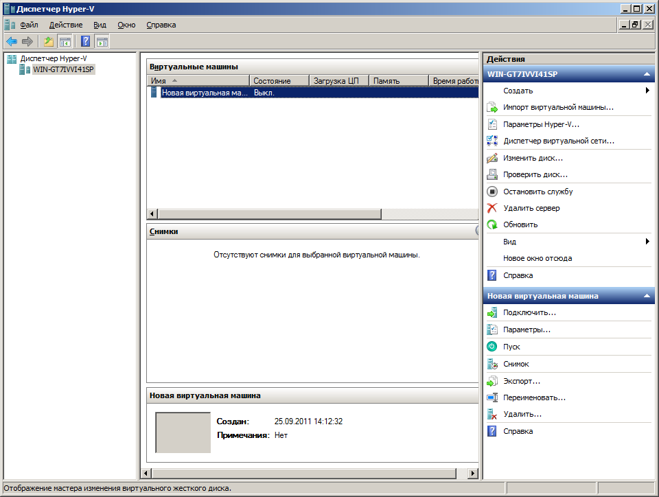 При помощи мастера изменения виртуального жесткого диска можно выполнять различные задачи по изменению виртуальных жестких дисков. Для запуска мастера запустите консоль Диспетчер Hyper-V, в меню Действие выберите Изменить диск.