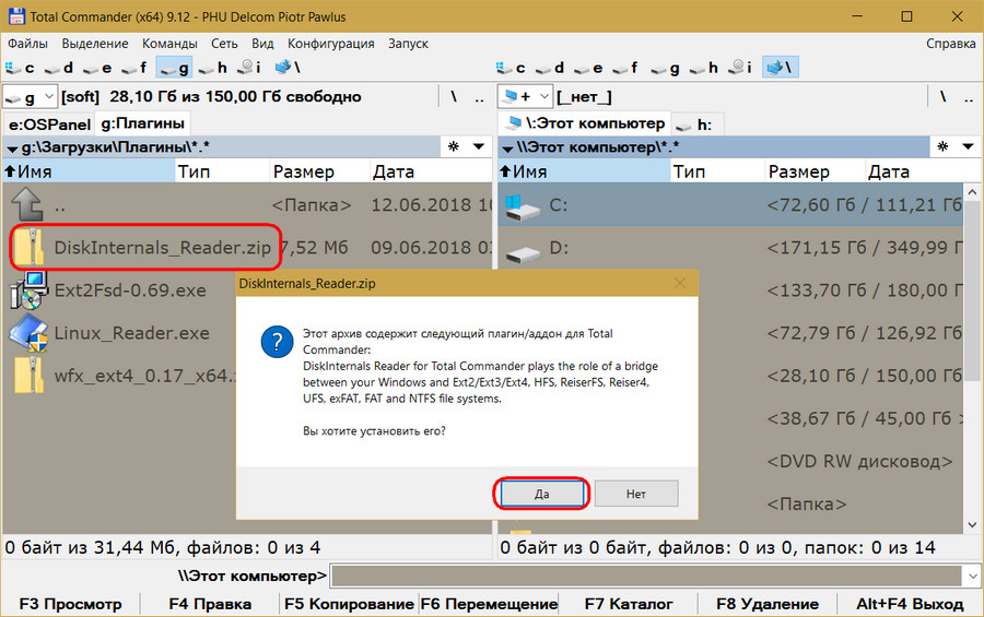 Распаковываем его внутри Total Commander. Отвечаем «Да» на предложение установки. Следуем шагам установочного мастера.