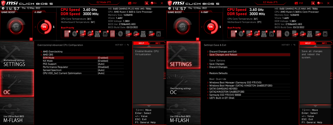 Нам понадобится включить виртуализацию в БИОСе. На примере процессора AMD Ryzen 5 3600 и материнки MSI B450 Gaming Plus MAX. В процессе загрузки компьютера запустите БИОС (нажатием Delete). Помните, всё зависит от конкретной модели Вашей материнской платы.