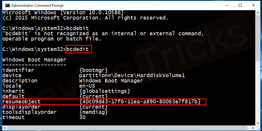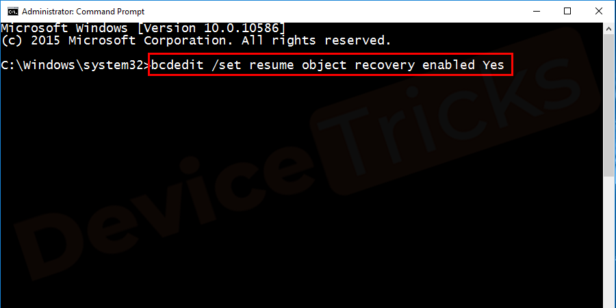 Note: After your system restarts without any problem, go to the command prompt with admin privileges. Type bcdedit /set resume object recovery enabled Yes and press enter.