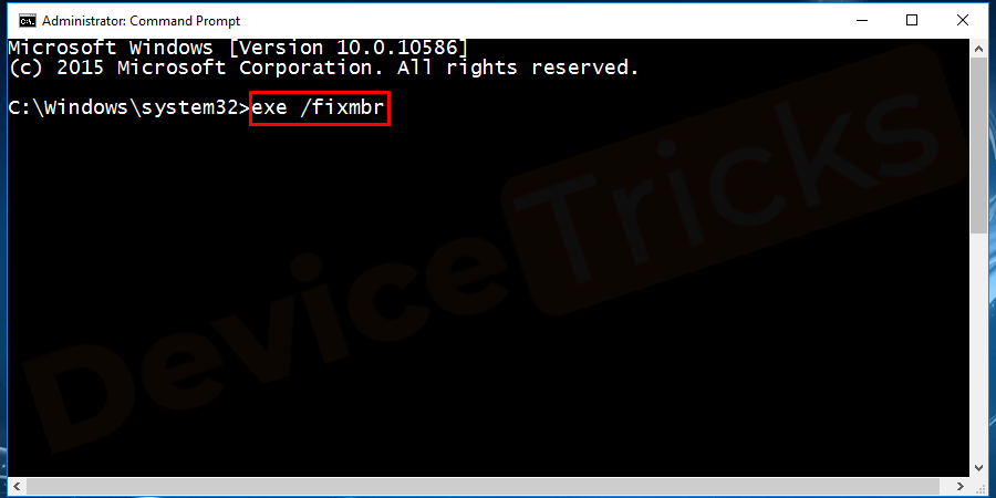 After executing the first command, enter exe /fixmbr and press enter.