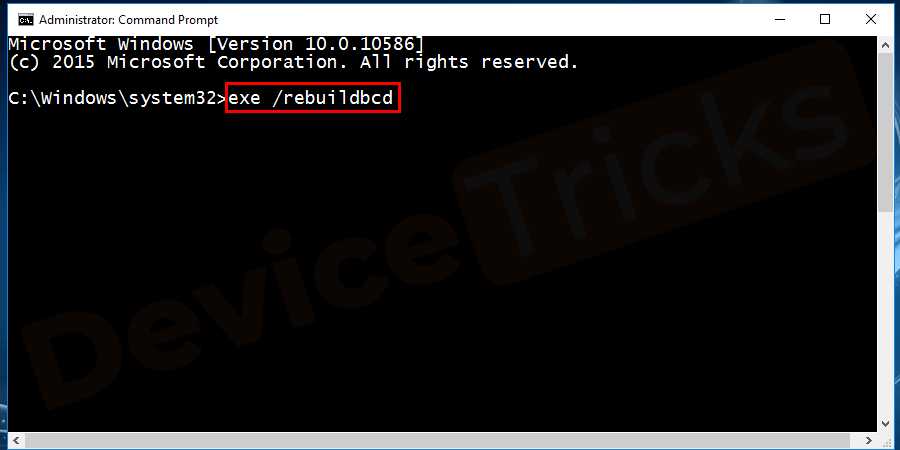 - Type exe /rebuildbcd and press enter.