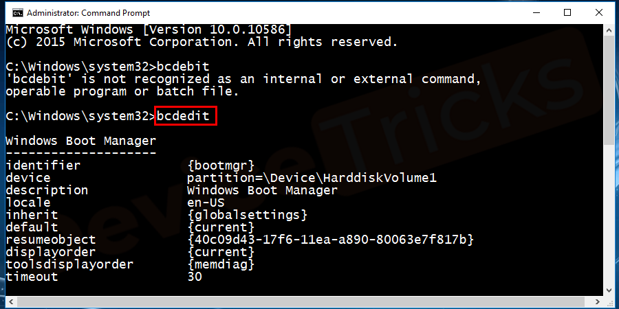 Type bcdedit and hit enter in the command prompt and you will a see the display of the result.