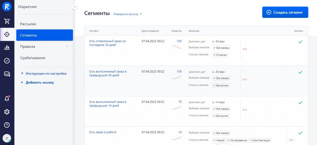 Это части заказов, разделенные по конкретным параметрам. Например, в сегменте с отменой заказа собраны клиенты, у кого был отказ от покупки за последний месяц. Настраивайте и добавляйте сегменты по своим потребностям: по полу клиентов, регулярности их заказов, сумме чека и т.д.