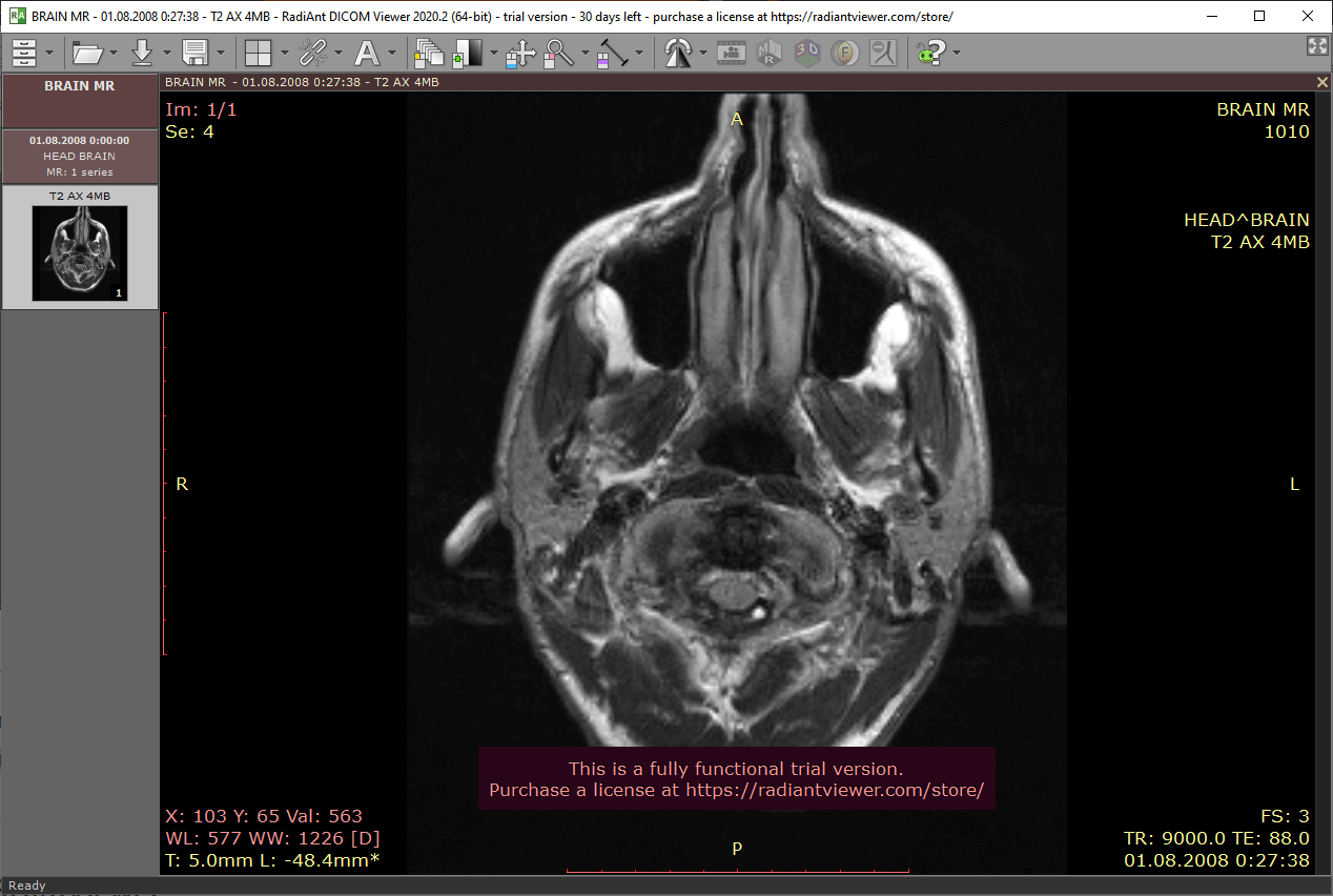 RadiAnt DICOM — это простая и быстрая программа, работающая на Windows. Она предлагает множество функций, включая MPR, MIP и слияние. Изображения можно экспортировать в JPEG, PNG и другие форматы. Для домашнего использования достаточно получить триал-версию, что делается в автоматическом режиме сразу после ее установки на компьютер, даже регистрироваться не нужно. Платная версия стоит всего 5 евро в месяц.