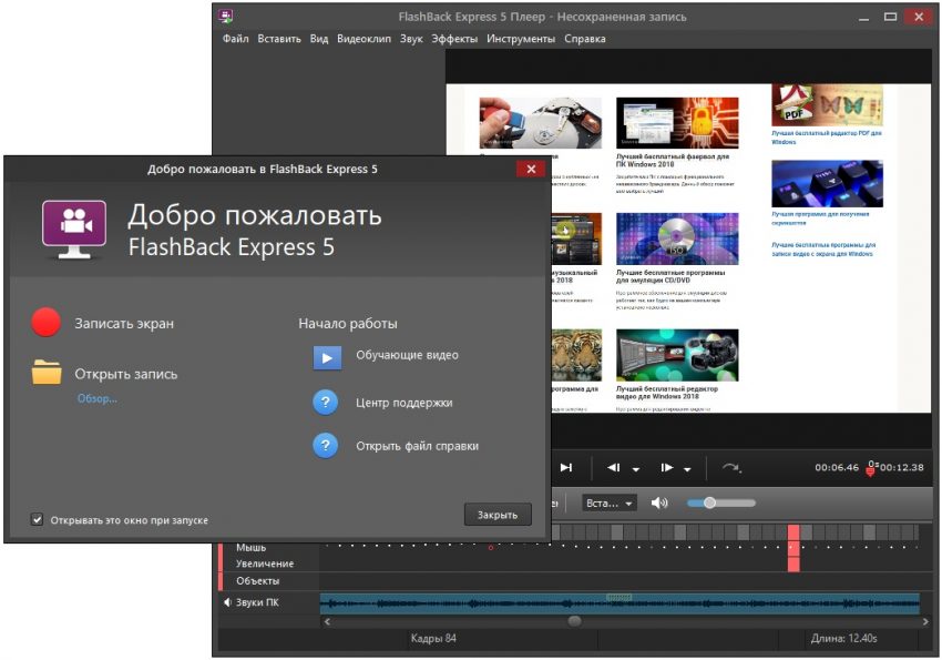 FlashBack Express – отличное приложение для записи экрана, с которым на удивление легко работать. Хоть это и бесплатная версия платной программы, FlashBack Express не оставит уродливых водяных знаков на ваших записях и не накладывает временных ограничений на продолжительность видео, а также имеет функции и инструменты, которым могут позавидовать даже некоторые платные программы. Интерфейс не такой сложный, как у OBS Studio, поэтому, если вы никогда до этого не пользовались приложениями для записи экрана, это будет отличным выбором.