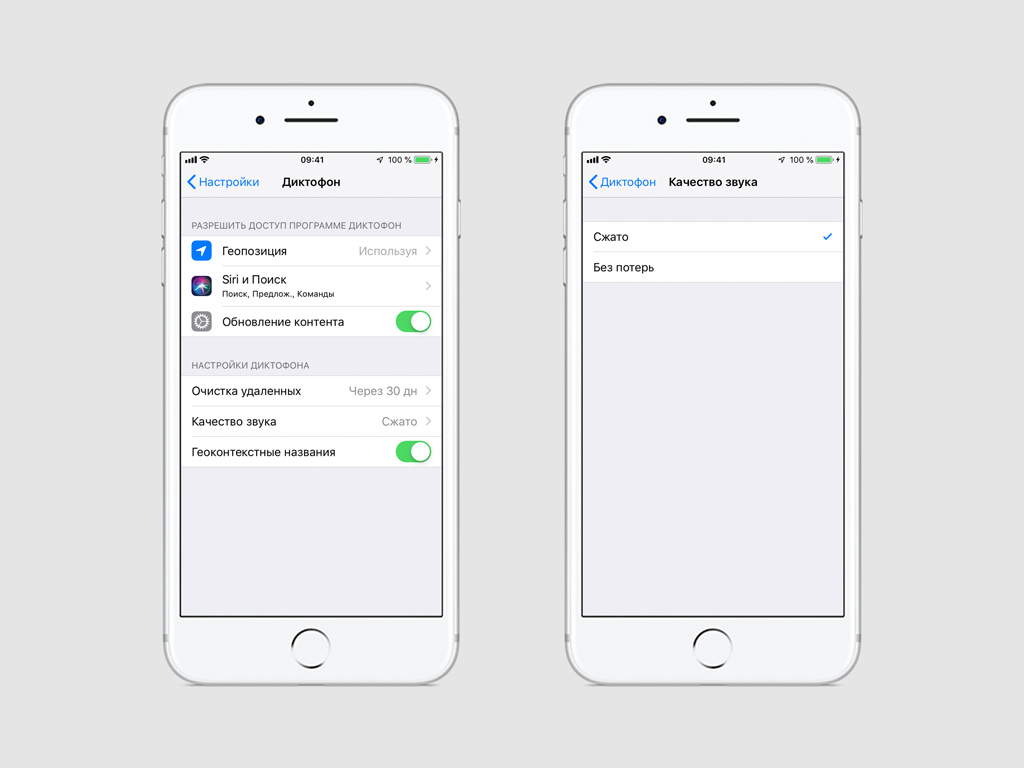 Делается это в том же разделе настроек меню «Диктофон», но уже в разделе «Качество звука». Изначально будет стоять «Сжато», но для лучшего качества есть пункт «Без потерь».
