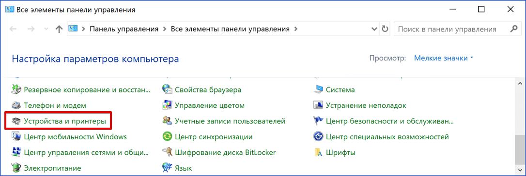 из списка результатов. Откроется панель Панель Устройства и принтеры управления.