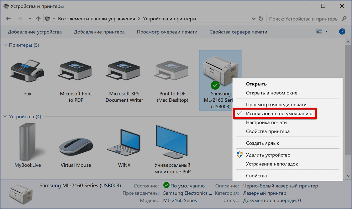 Для установки действующего принтера устройством по умолчанию необходимо кликнуть правой кнопкой мышки по значку устройства и поставить галочку напротив параметра «Использовать по умолчанию» либо просто выбрать данный параметр.