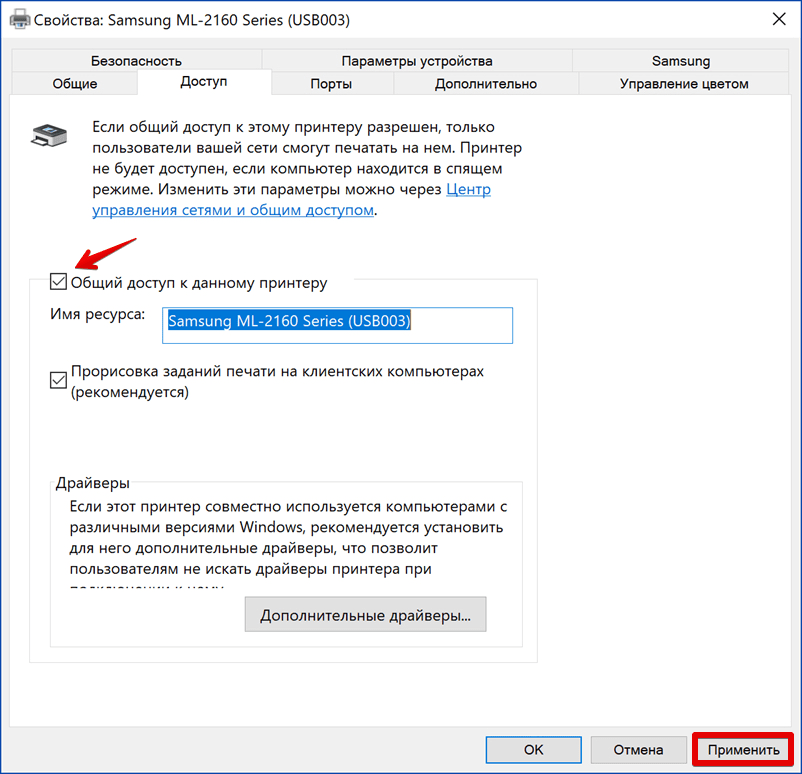 Теперь нам становится доступна настройка сетевого принтера. Проставляем галочку в отмеченном стрелкой месте, чтобы сделать его видимым с других ПК.