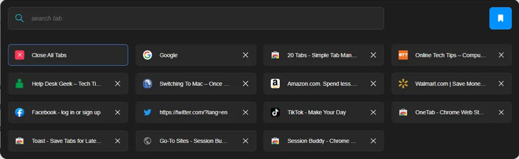 2oTabs предлагает полезное окно поиска вверху, чтобы найти нужную вкладку. Используя кнопку на панели инструментов, вы также можете использовать значок закладки, чтобы назвать и сохранить группу вкладок и получить к ней доступ позже.