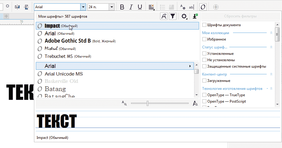 В Кореле присутствуют стандартные и графические гарнитуры (знаки символов в них являются изображениями).