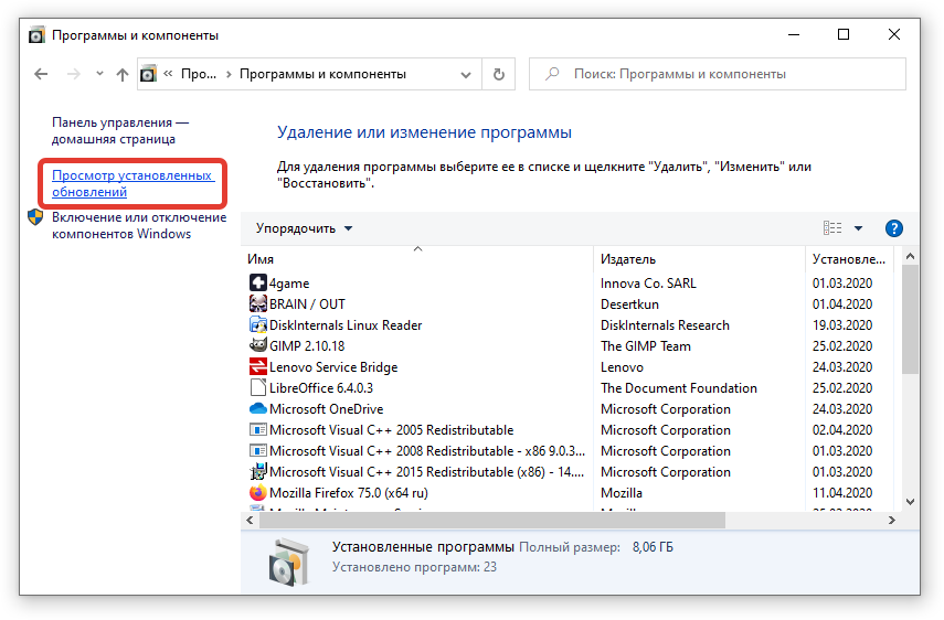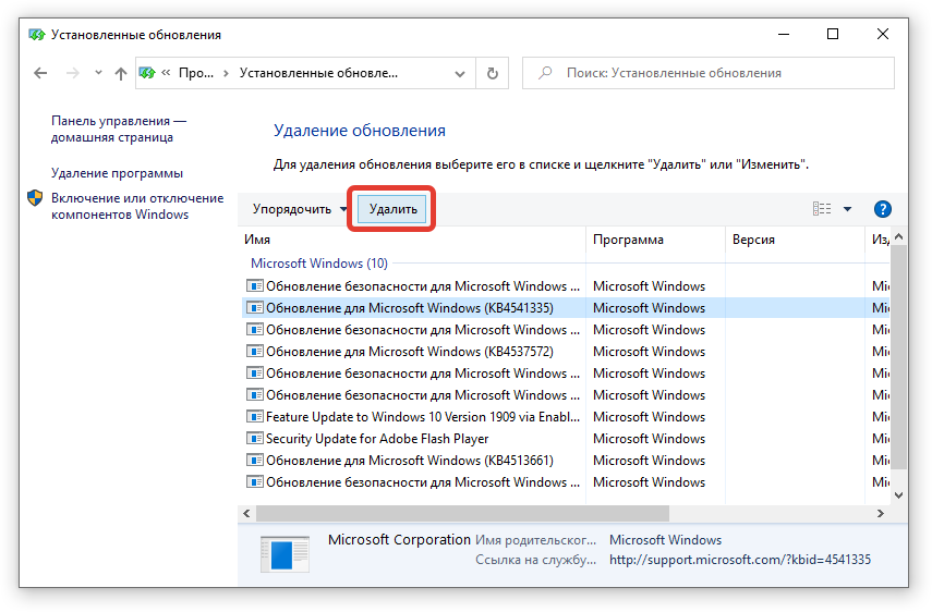 Отобразится список апдейтов с кодовым обозначением, информацией от издателя и датой установки. При необходимости пользователь может деинсталлировать программу, выделив необходимую и нажав кнопку Удалить.