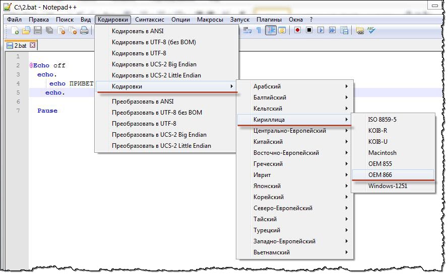 Как понимаете, получим крякозябры.Выход: использовать специальный редактор, который сохраняет батник в кодировке CP-866.