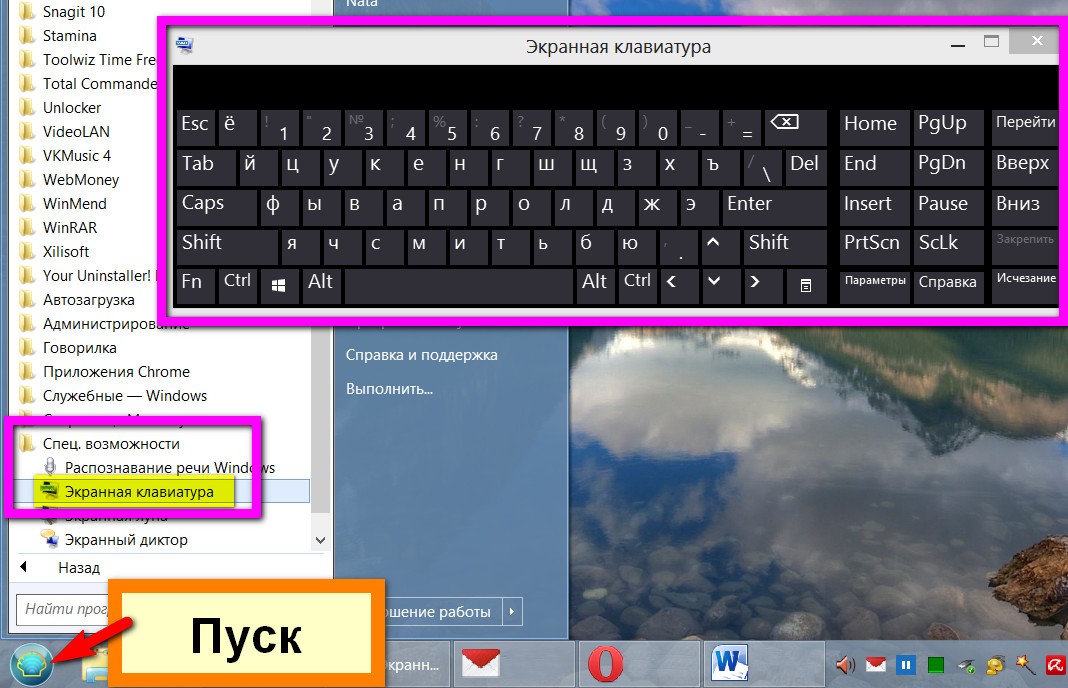 Щелкаем на кнопке “Пуск”, выбираем “Специальные возможности”, далее – жмем “Экранная клавиатура”, запуская, таким образом, штатное приложение, эмулирующее клавиатуру физическую.