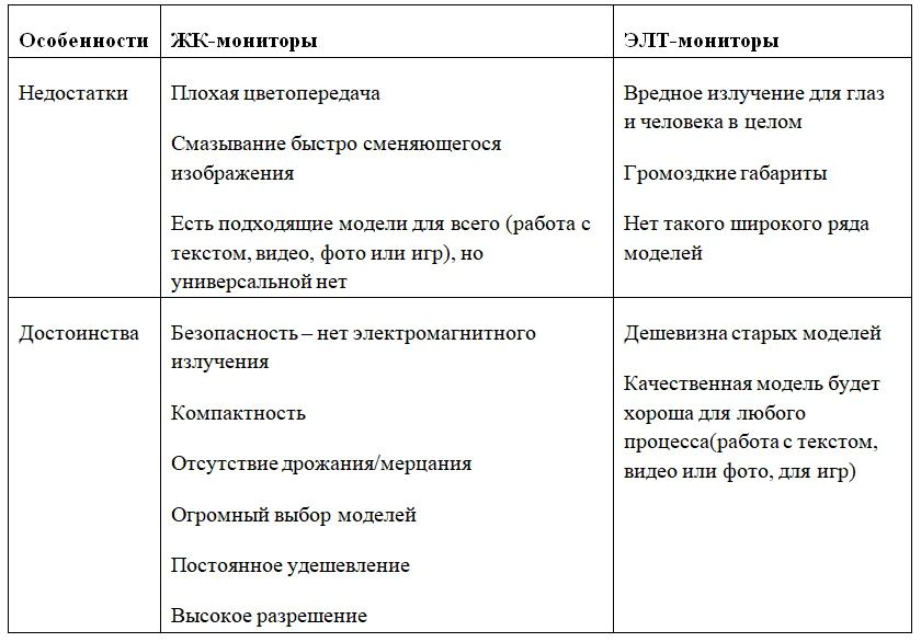 - монитор – блок компьютера, на который выводится визуальная информация (символы, графика). Представлены ЖК мониторами и устаревшими ЭЛТ;