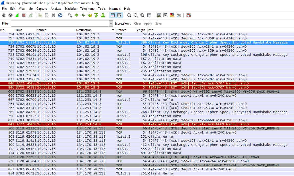Раз уж Fiddler помог добыть список IP, то их массовое добавление в файл hosts должно помочь прекратить слежку. Проверим, создав список блокировки, и снова запустим Wireshark.