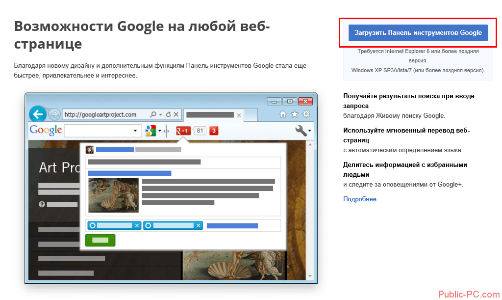 И здесь никуда не деться без Google-переводчика. Нам нужно скачать панель инструментов Google с официального сайта. Кликаем на синюю иконку «Загрузить…».