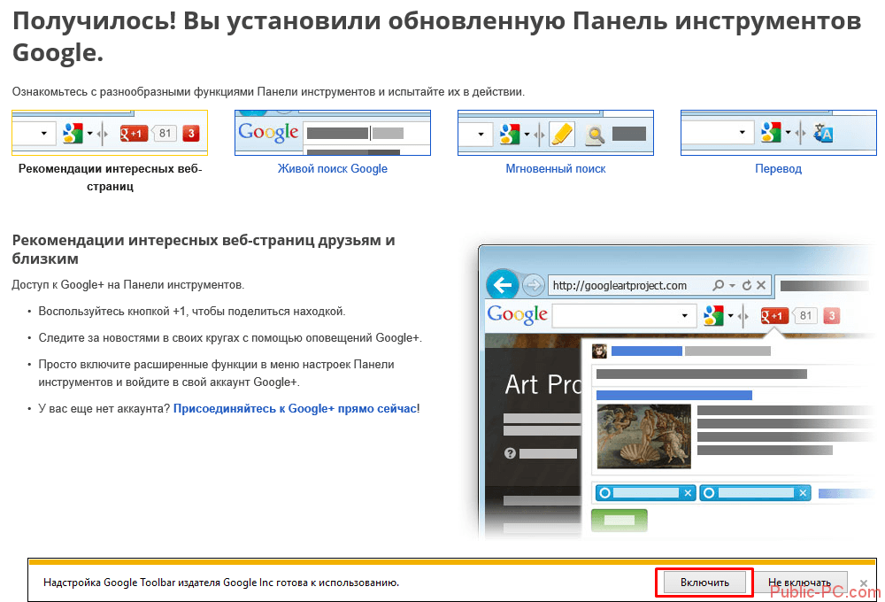 Но обратите сразу внимание на нижнее окно. Для запуска Google Toolbar нужно кликнуть на «Включить»